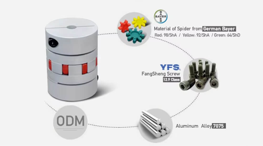 The jaw coupling is mainly composed of aluminum alloy and polyurethane elastomer, which can buffer the vibration during the transmission process, absorb the impact caused by uneven motor speed, and effectively correct the axial, radial and angular installation deviations.